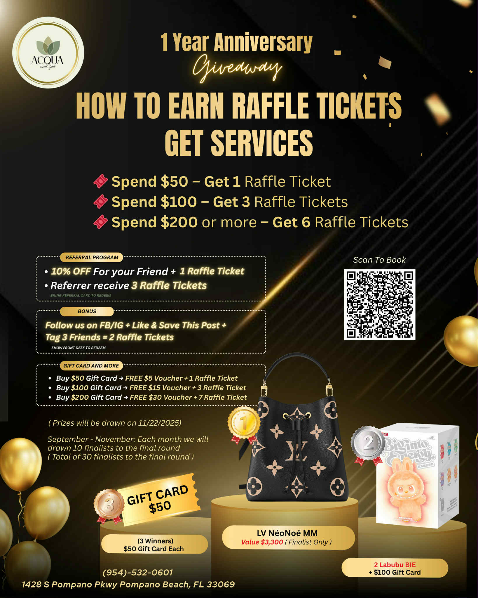 With each visit, you'll receive a raffle ticket, bringing you one step closer to winning these fabulous prizes for our Anniversary Event.